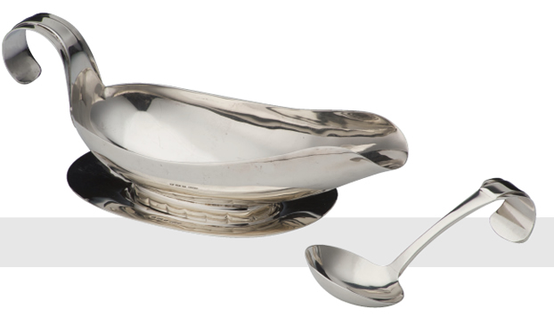 SAUCE BOAT and stand with ladle. The boat of elongated form. London 1955.