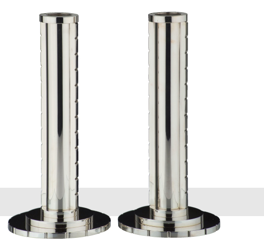CANDLESTICKS with three tier circular base with triangular 'nicks' to the lower tier. The cylindical column flanked by two rectangular strips with the same nicks. London 1988.