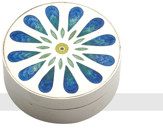 BOX of circular form, the pull-off cover enameled with a stylised flower. London 1978.