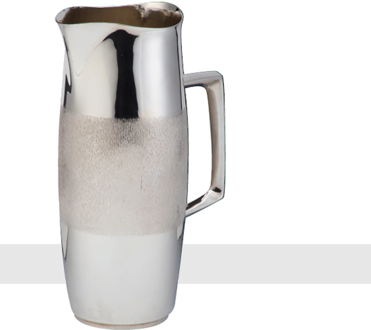 WATER JUG handraised with an almost cylindrical form with a rectangular handle. Central third of the body finely textured, the remainder polished. London 1968.