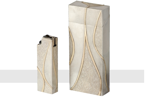 CIGARETTER CASE and LIGHTER in sterling silver and 9 carat gold. The silver finishes are textured and satin finish, the dividers bewteen the two are 9 carat gold. London 1997.