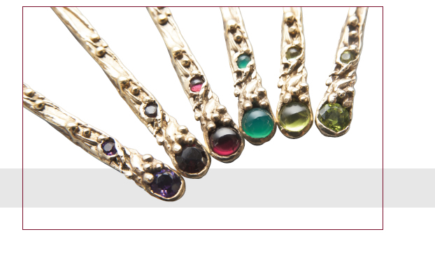 COFFEE SPOONS in silver gilt with cast handles decorated with twigs and berries. Each handle set with two gemstones (garnet, periodt, amethyst, ruby and emerald). London 1988.