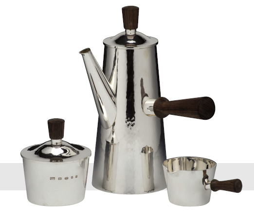 COFFEE SERVICE comprising three pieces. Handraised. Of circular form, the pot tapered with straight hardwood grip handle, the milk and sugar flared, the milk with a hardwood grip handle, the sugar cover with a hardwood knob. London 2003.