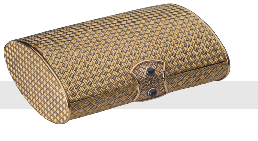 BOX for pills formed from woven 18 carat white and yellow gold strands. Bearing stamped marks for Boucheron. London 1961.