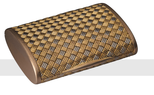 BOX for pills formed from woven 18 carat white and yellow gold strands. Bearing stamped marks for Boucheron. London 1961.