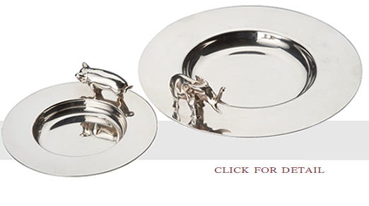 PIN TRAY of circular form, the rim set with the model of a pig. Another, the rim set with the model of an elephant. London 1987 and 1989.