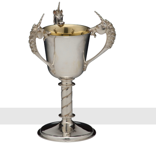 GOBLET with three unicorn handles and a spiral-grooved stem. London 1990.