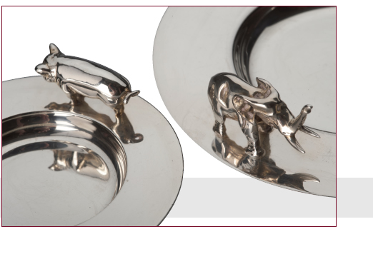 PIN TRAY of circular form, the rim set with the model of a pig. Another, the rim set with the model of an elephant. London 1987 and 1989.
