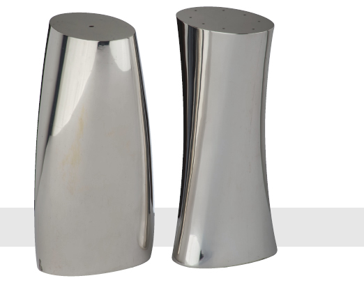CONDIMENT SET comprising salt and pepper. The pieces are very sculptural. Both of oval cross-section, the curve of the salt's body is concave and that of the pepper convex. London 1969.