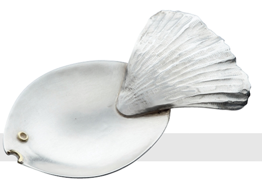 CADDY SPOON in the form of a fish. Satin finish, the bowl is the fish's body with circular gold eye and the chased tail its handle. London 2001.