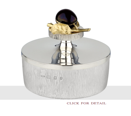 TOBACCO CANISTER commissioned by the Ionian Bank and given to the Damson Oil Company. The 18 carat enameled damson, which rests on an 18 carat gold stalk with gold two leaves at the side, opens to reveal an articulated 'nodding donkey'. London 1980.