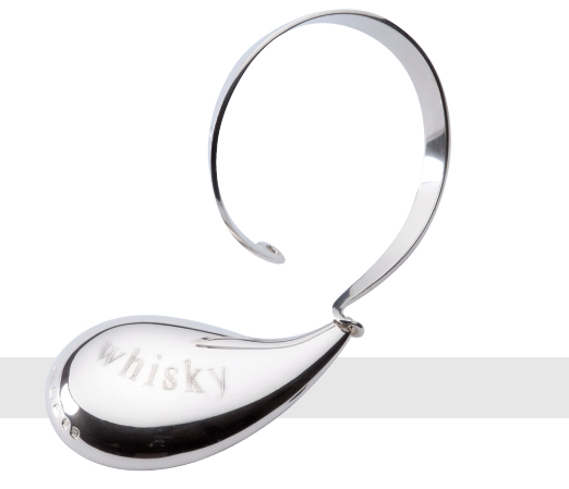 WINE LABEL for whisky of tear-drop form suspended from a silver spiral ribbon. Made to commemorate the Wine Label Circle's 50th anniversary. Named by the maker 'The Last Drop'. London 2001.