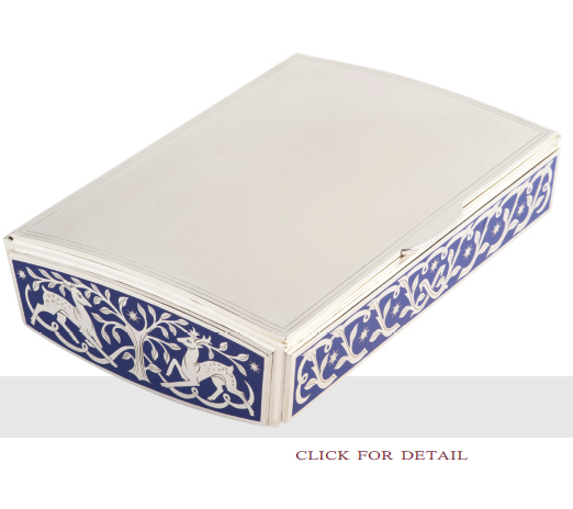 BOX for cigarettes with plain concave lid, the sides with enamel decoration in royal blue. Probably made by Vic Le Bossart of Padgett & Banham. Retailed by Garrard & Co, designed by Styles. London 1957.