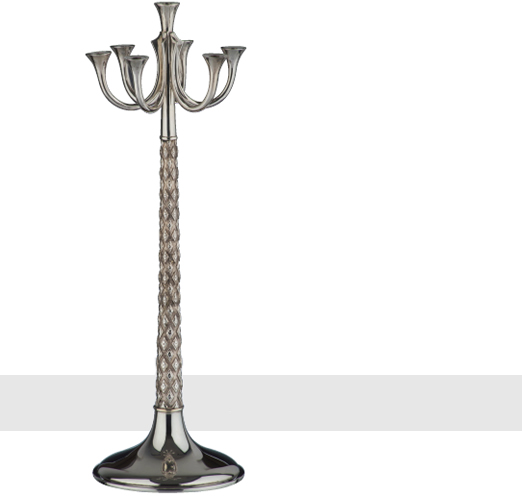 CANDELABRUM with circular polished pedestal base from which a palm trunk with a matt finish rises. This terminates in six curved branches to receive the candles with a central sconce at a higher level. London 1978.