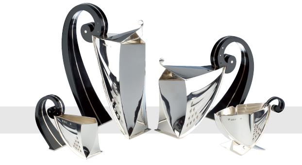 TEA SERVICE teapot, hot water jug/coffee pot, milk jug and sugar bowl and spoon. Designed by Paul Marsden and made by Ian Calvert. London 1993.