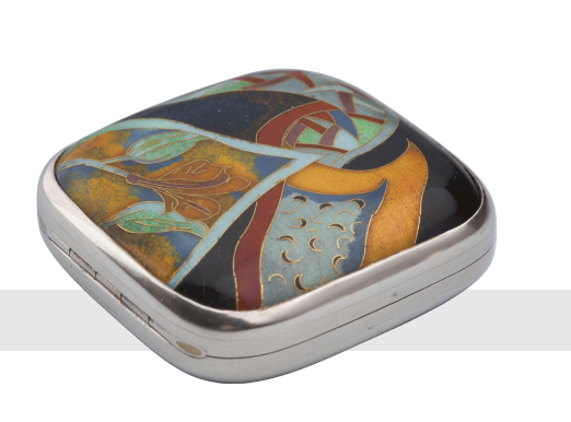 BOX of square form with hinged cover, presumably for containing pills. Enameled on the cover and base in primary colours with abstract forms. London 1980.