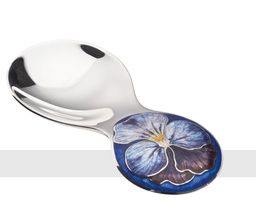 CADDY SPOON the circular bowl forming into a broad handle which is enameled with a light blue and purplr viola against a royal blue background. London 2008.