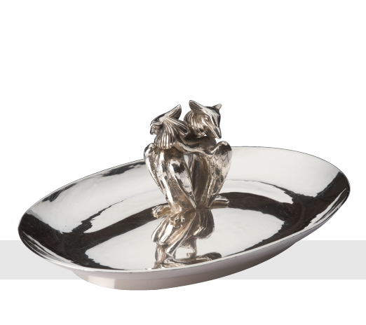 DISH of oval form with a cast sculpture of two birds, their necks entwined. London 1957.