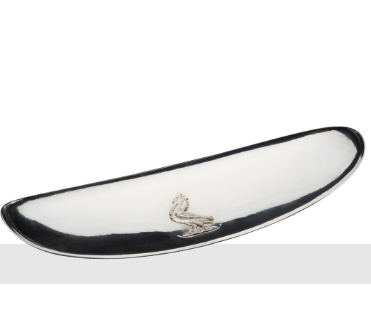 DISH of elongated concave form upon an oval collet foot. The centre of the dish applied with with a model of a secretary bird, which was originally surrounded by an inscription, now removed. London 1969.