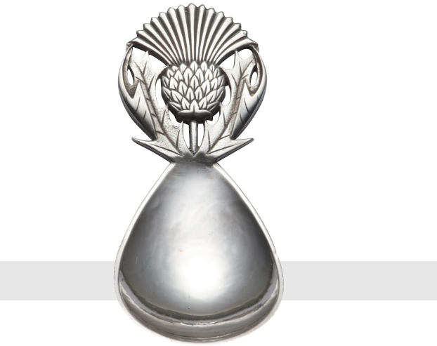 CADDY SPOON with an oval bowl, the handle a thistle in full flower. Edinburgh 1975.