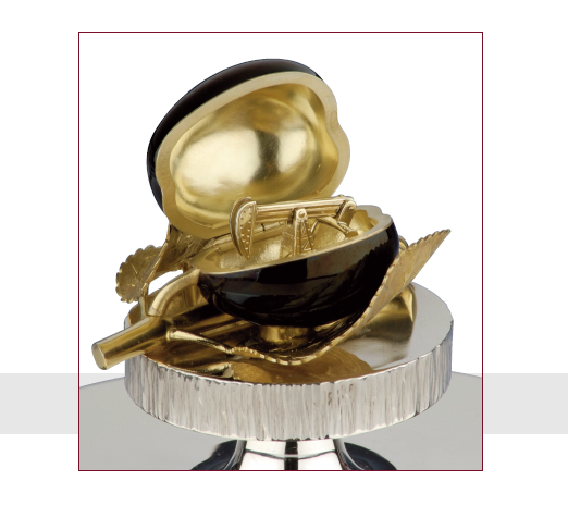 | TABLE BELL in silver gilt and enamel. The tapered bark