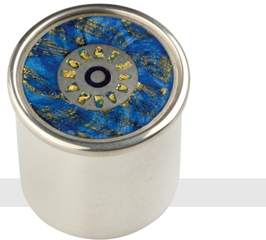 BOX of circular form, the pull-off cover enameled predominantly with blues but also in green and gold. London 2000.