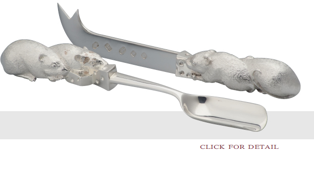 CHEESE SET comprising cheese knife and stilton scoop each featuring a cast of two mice both eating a wedge of cheese. London 2008.